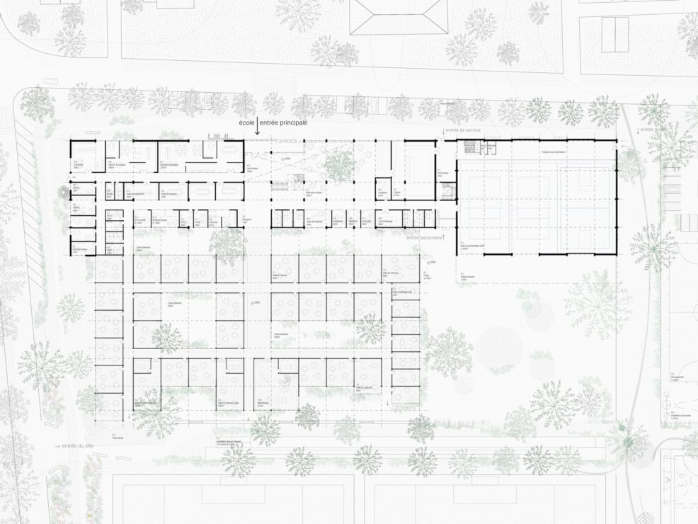 One of the core principles of Dardanët is the continuity of green spaces. The project extends the natural landscape from the west into the site through horizontal pathways that organize the program, allowing the landscape to evolve from wild, river-side greenery to a more structured, semi-urban environment near the site’s vertical axis. The careful distribution of the program ensures that school activities are located at the northern end of the site, directly accessible from Chemin du Pissot. This organization filters and distributes spaces, starting with educational functions and extending toward other community uses. A second key building, positioned at the intersection of the site’s two main axes, serves as a hub of activity, housing an auditorium, locker rooms, and a café/restaurant. This central gathering point fosters interaction between various user groups, creating a social and multifunctional heart for the site.